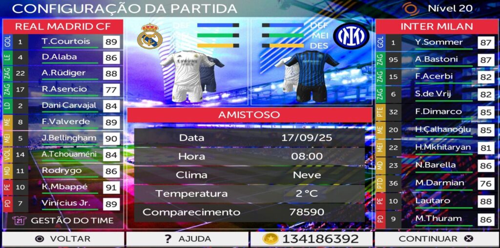 Desfrute de todos os modos de jogo do FTS 2026 Europeus Atualizado, até mesmo do Rumo ao Estrelato, um dos modos de jogo mais admirado pelos fãs de futebol virtual. Isso mesmo, um jogo de futebol para celular android com um dos melhores modos de jogo da história. Faça história com sua equipe no Modo Carreira, o modo de jogo mais adorado por todos os amantes de jogos de futebol, agora no FTS 2026 Europeus Atualizado e 100% licenciado, com logos, uniformes, estádios e faces realistas. Ao entrar no jogo, antes de jogar seu modo de jogo preferido, jogue uma partida diária como aquecimento, assim você pode conseguir algumas moedas que te ajudaram em sua jornada. Uma partida amistosa é sempre bom para praticar um pouco e aprender novos comandos, mas para ficar bom mesmo no FTS, use o modo treinamento, onde você pode bater penaltis, faltas, defender penaltis, treinar escanteios e fazer um treino livre para aprimorar suas jogadas por completo.